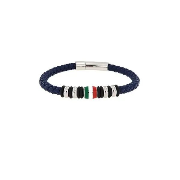 (708) 716-3626Blue Braided Leather and Stainless Steel Bracelet with Italian Flag Accent