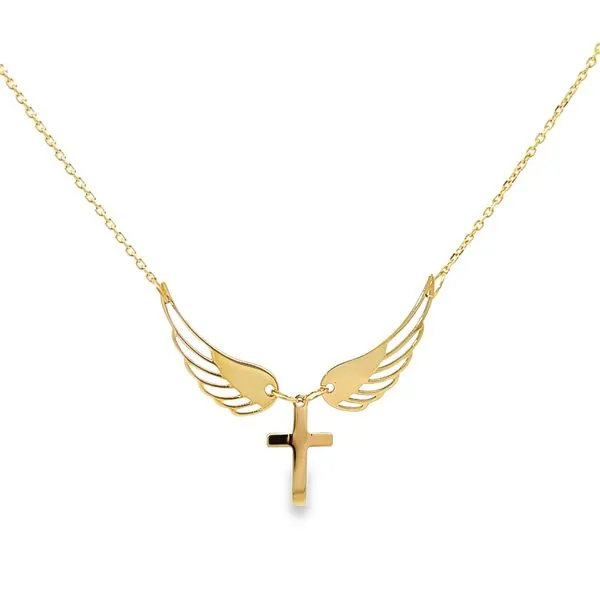(708) 716-362618K Yellow Gold Cross and Angel Wings Religious Necklace