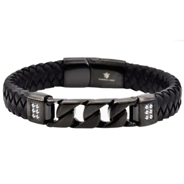 (708) 716-3626Black Leather And Black Stainless Steel Curb Link Bracelet