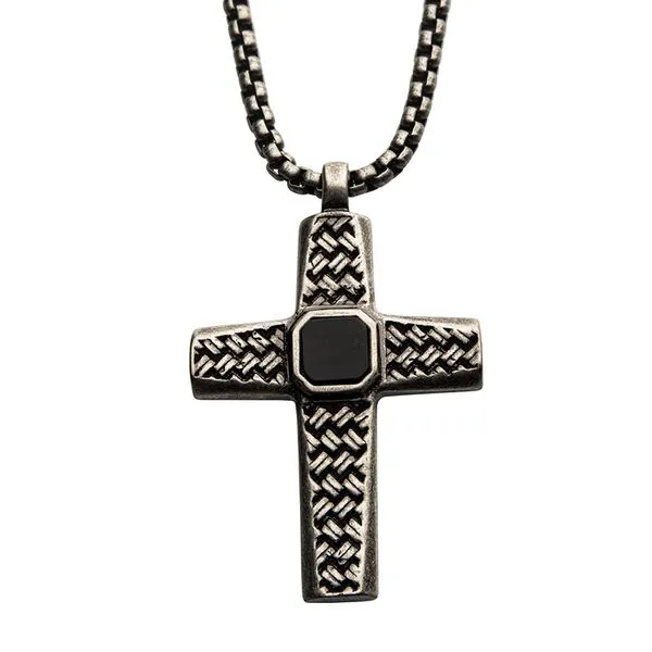 (708) 716-3626Stainless Steel Silver Plated Cross Pendant with Black Agate Stone, with Steel Box Chain