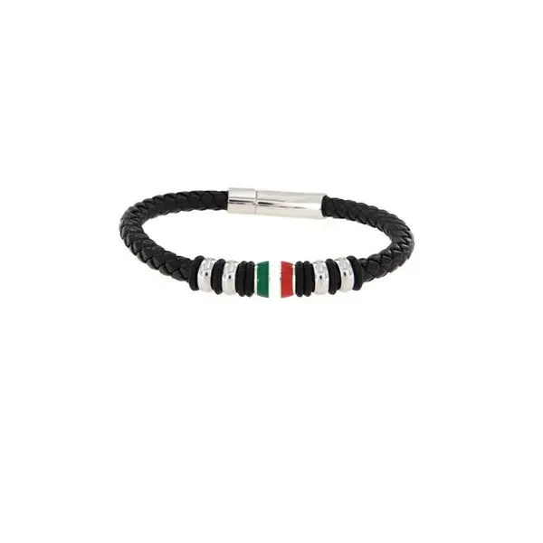 (708) 716-3626Black Braided Leather Stainless Steel Bracelet with Italian Flag Accent