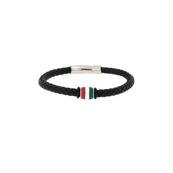 (708) 716-3626Black Braided Leather Steel Bracelet with Italian Flag Accent