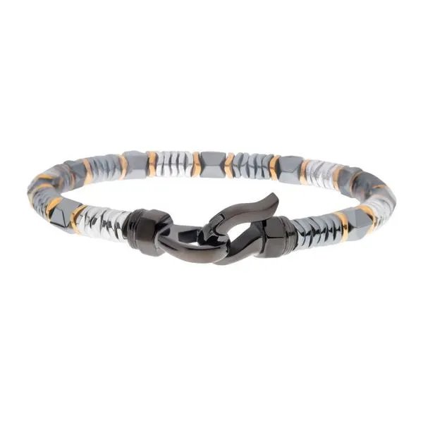 (708) 716-3626Black & Gold Hematite Beads Bracelet with Hinged Steel Hook Clasp