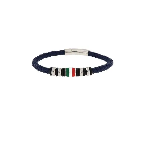 (708) 716-3626Blue Braided Leather and Stainless Steel Bracelet with Italian Flag Accent
