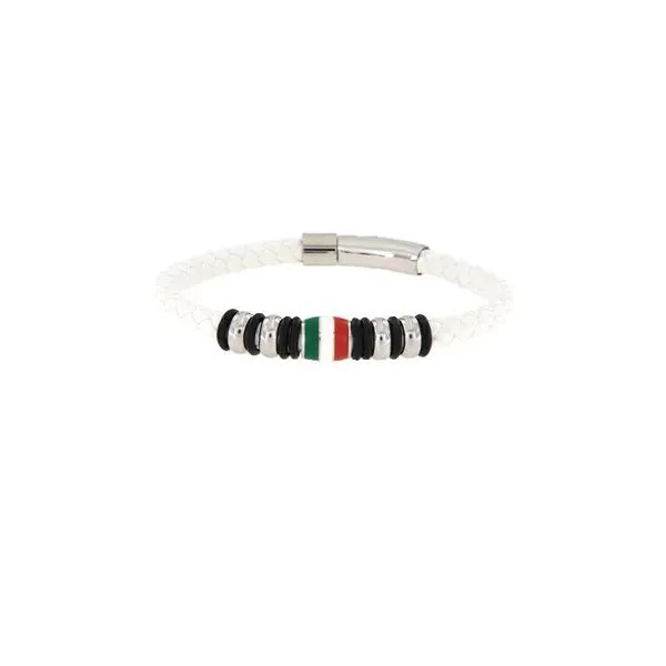 (708) 716-3626White Braided Leather Steel Bracelet with Italian Flag Accent