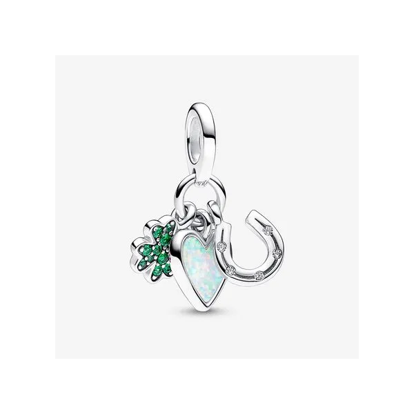 (708) 716-3626Four Leaf Clover, Heart and Horseshoe Triple Dangle Charm