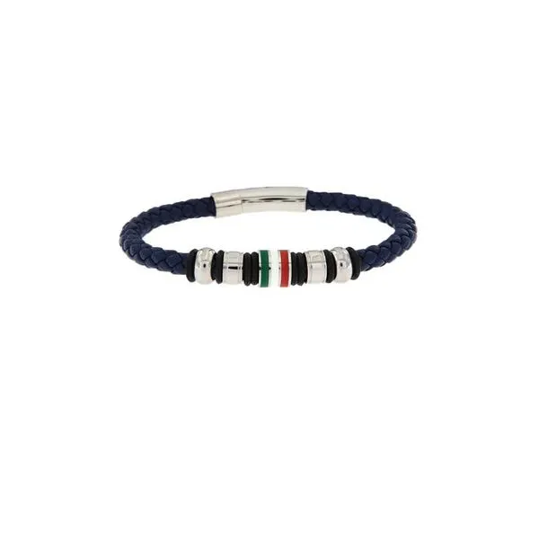 (708) 716-3626Blue Braided Leather and Stainless Steel Bracelet with Italian Flag Accent